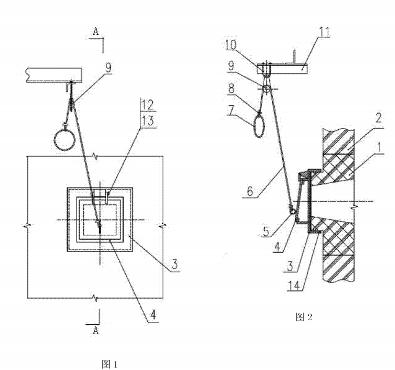 图中:1、窥视孔砖,2、熔窑墙体,3、窥视孔框架,4、窥视孔密封门,5、吊环螺栓,6、钢丝绳,7、拉环,8、钢丝绳夹,9、定滑轮,10、U型螺栓,11、角阀,12、开口销,13、销轴,14、保温棉。