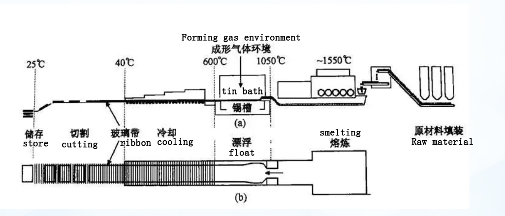 Float glass: under the melting state, the glass liquid continuously flows out from the furnace and floats on the metal tin liquid level filled with protective gas. Under the combined action of its own gravity, surface tension, edge roller and transmission tension, it forms a glass belt with uniform thickness, parallel surface, flat and polished, and then annealing, cooling and cutting is an efficient and high-quality method for manufacturing flat glass. Its glass products have the characteristics of good surface flatness, uniform thickness, no water ripple, and no deformation of the original glass plate during deep processing. The glass production line has the advantages of low energy consumption per unit product, long continuous operation cycle, easy to realize the mechanization and automation of the production line, and high labor productivity.